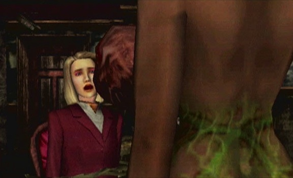 D2 also had a very dark story, set in the snowy Canadian wilderness, you played Laura Parton. You are on a plane when it’s taken over by hijackers. Plane crashes near a mysterious cabin and factory where these crazy creatures who are a cross between John Carpenter’s The Thing and the hentai anime series Urotsukidoji. Kenji san again was upset that the ESRB ordered the game censored for the US release. The Japanese version features a tentacle creature phallicly inserting itself into the mouth of a female character resembling a blow job and also one of the characters eludes to molesting his very young grand daughter and when it’s time to defeat him he turns into a multi tentacled creature who spouts semen at you.